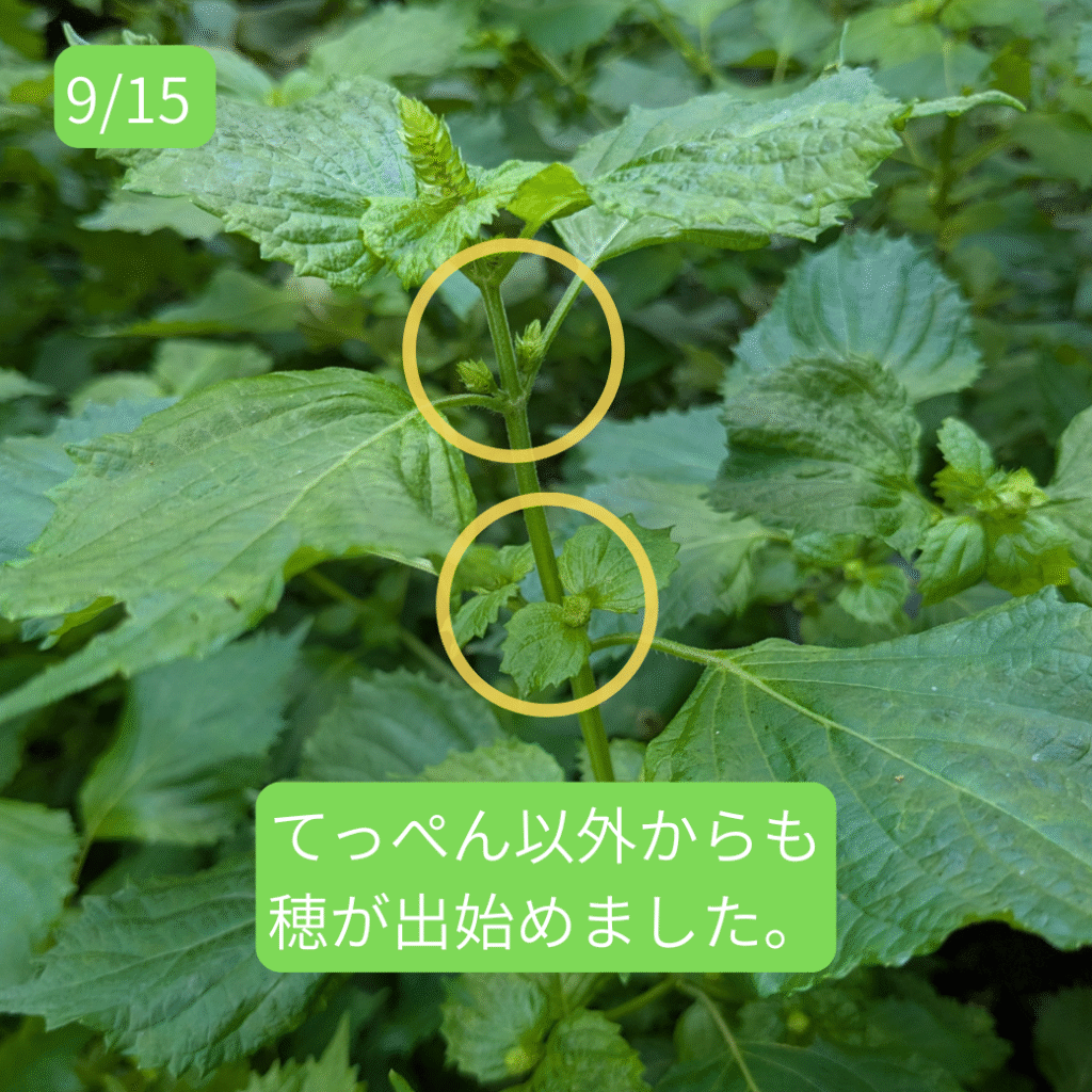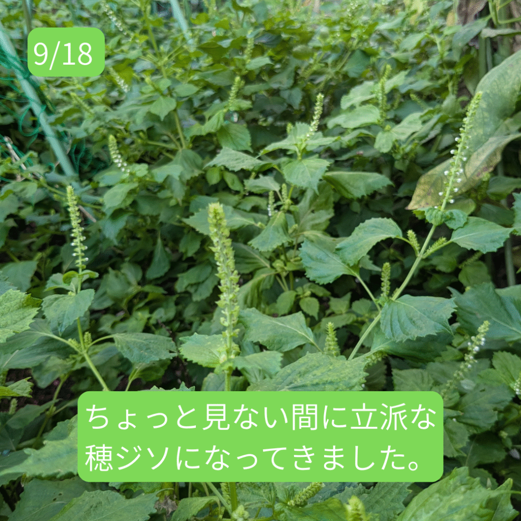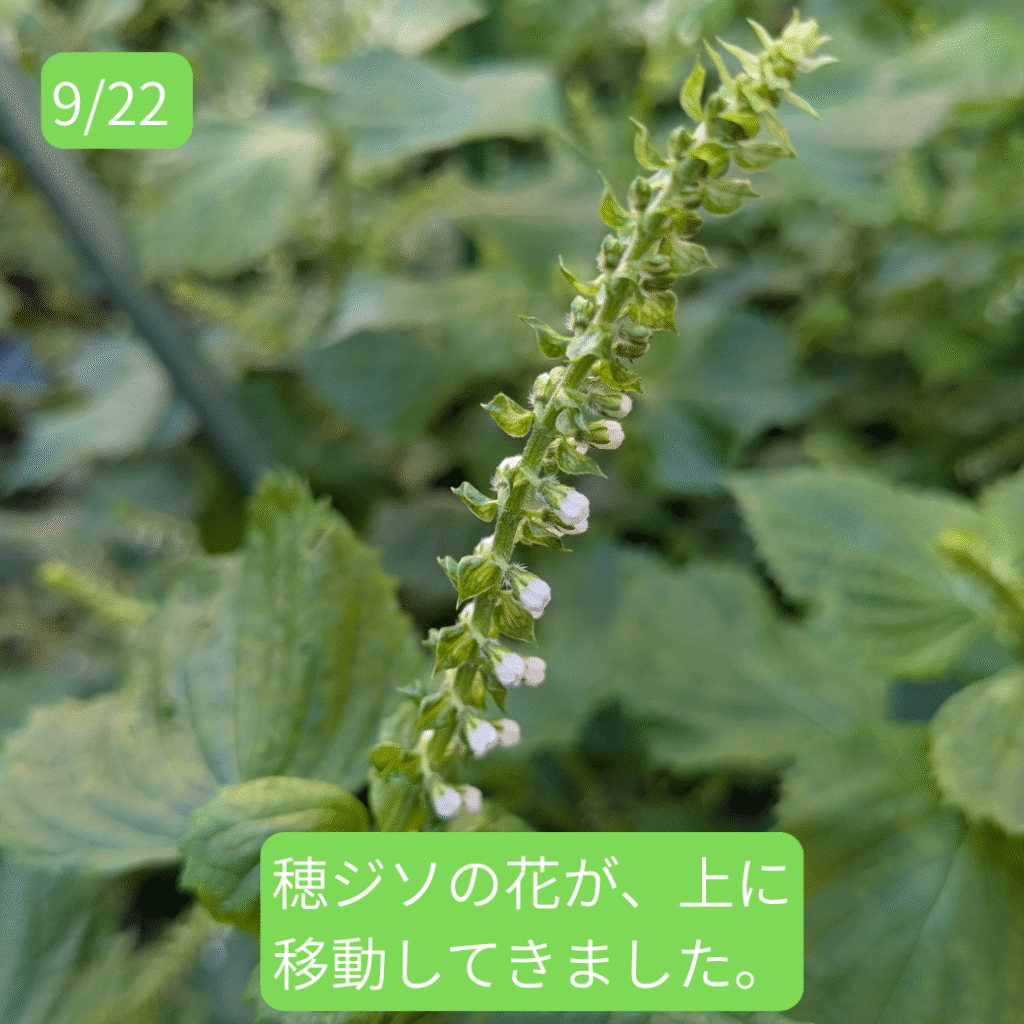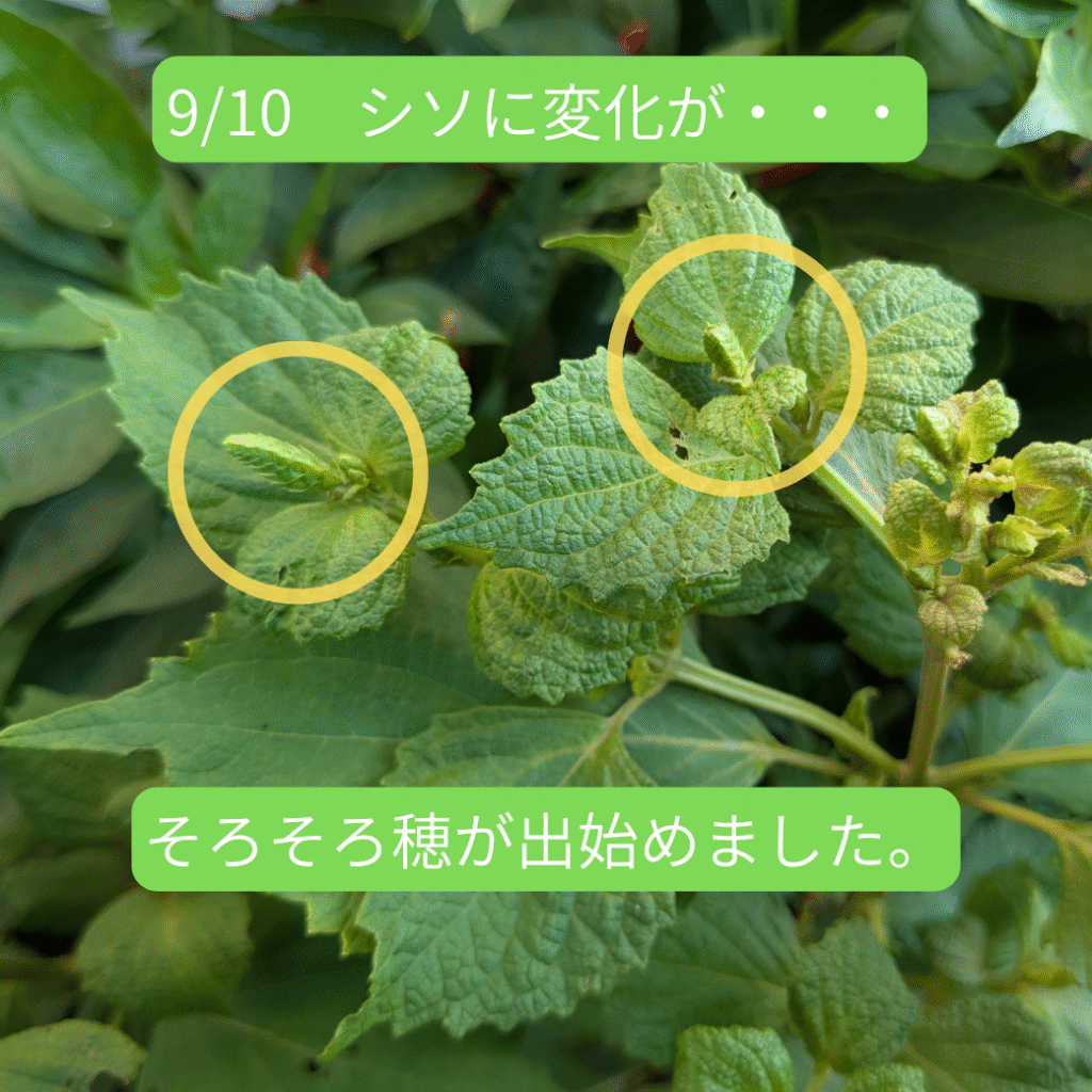 6月頃から皆さんに大葉をお届けしていたシソですが、葉はだんだんと固くなり、お渡しするにはちょっと・・・という感じになってきました。そして、9月に入るとさらに様子が変わってきました。そうです。穂ジソになる準備が始まったのです。