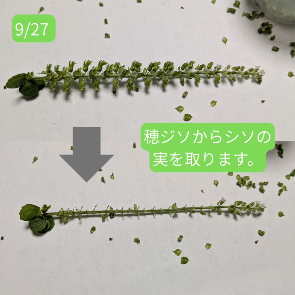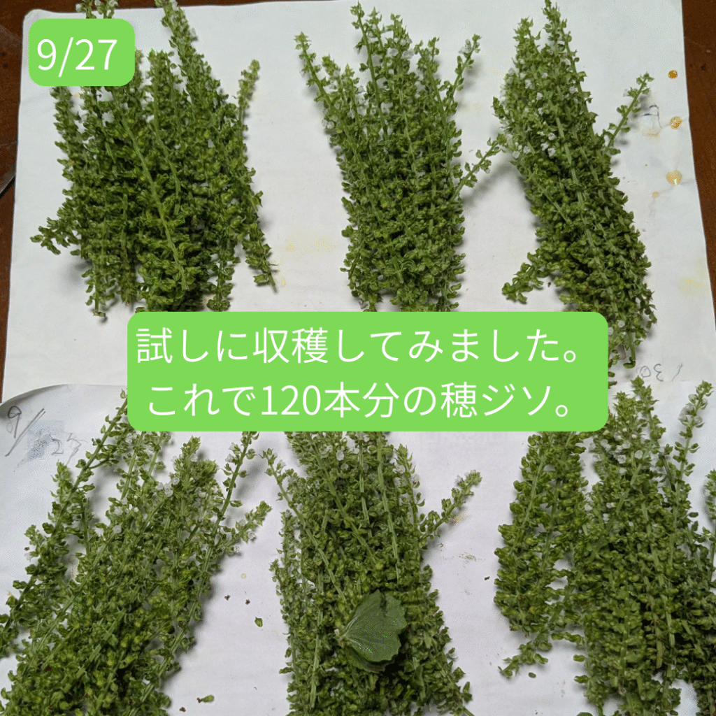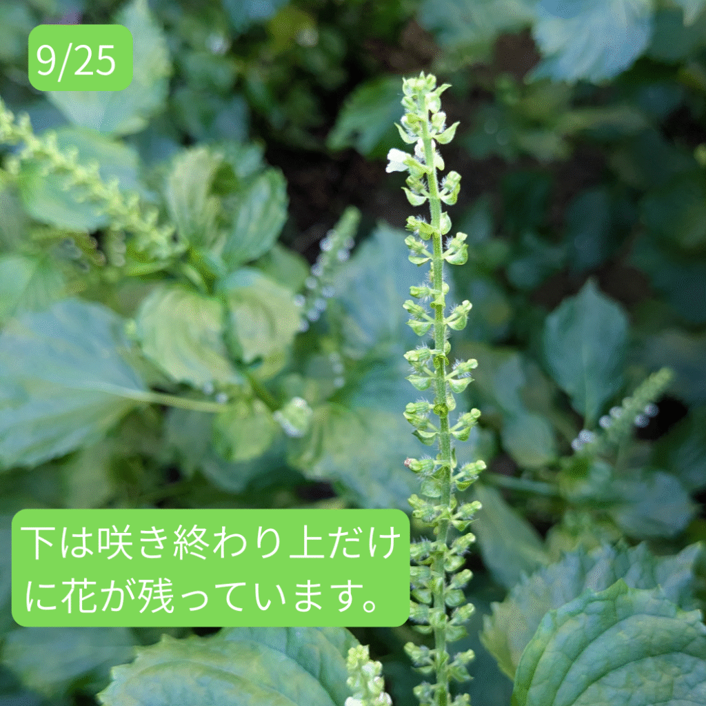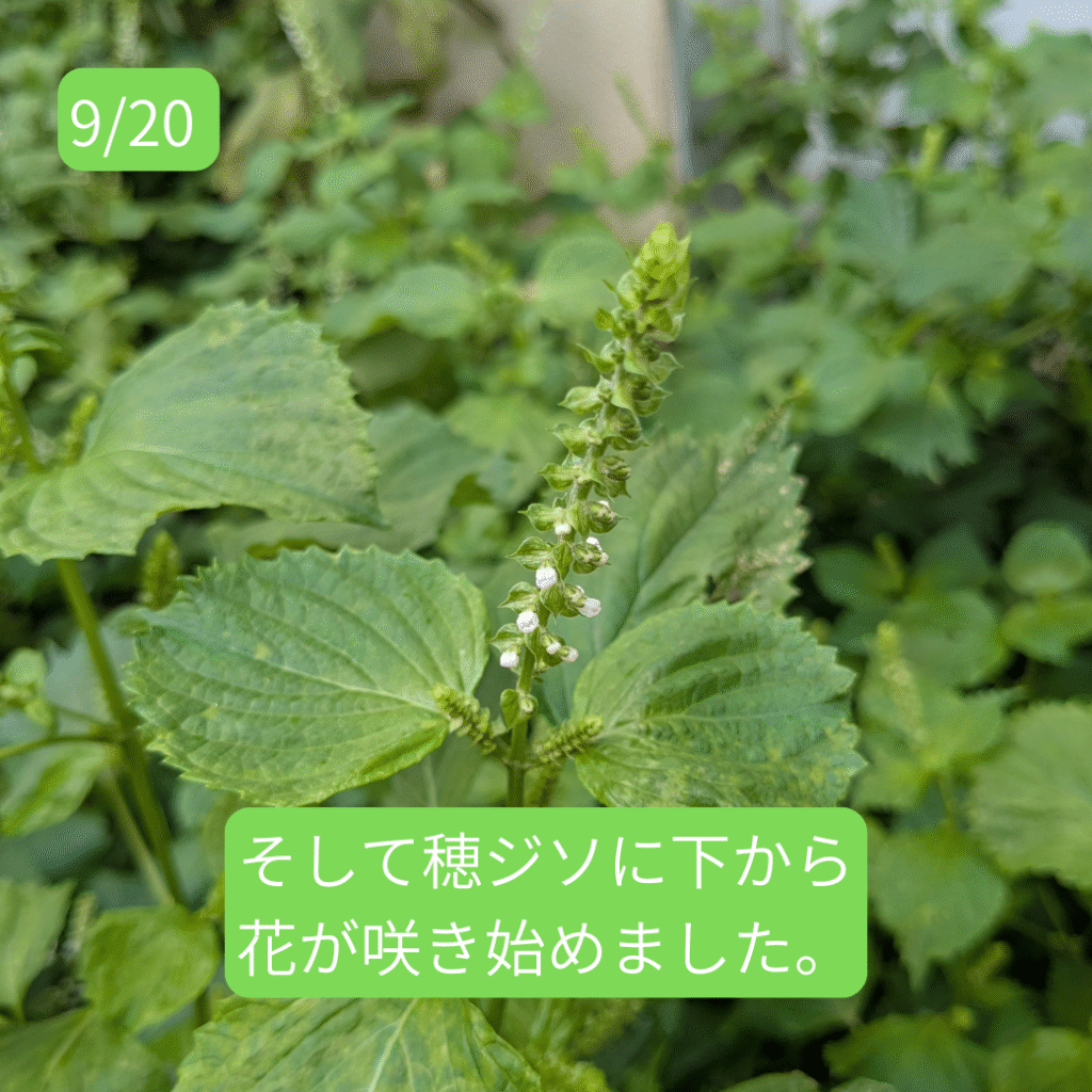 6月頃から皆さんに大葉をお届けしていたシソですが、葉はだんだんと固くなり、お渡しするにはちょっと・・・という感じになってきました。そして、9月に入るとさらに様子が変わってきました。そうです。穂ジソになる準備が始まったのです。