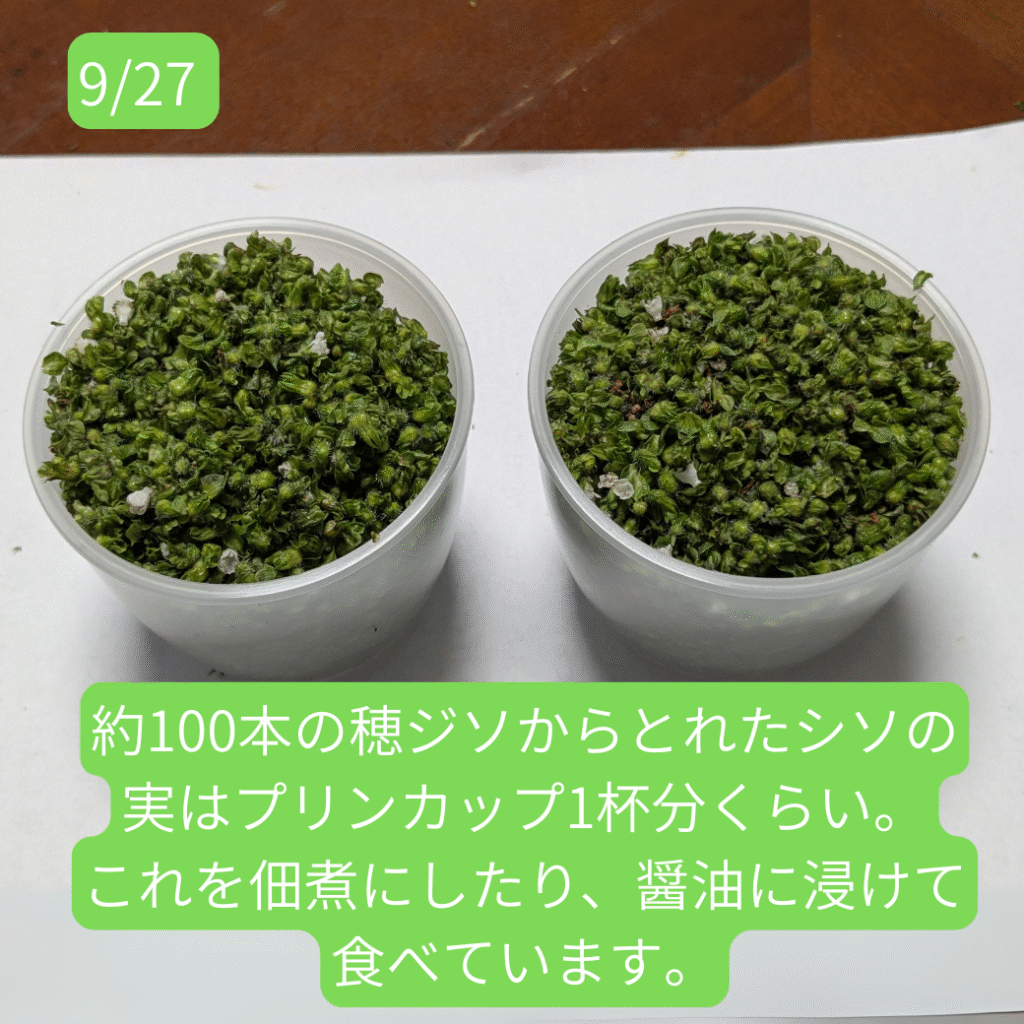 そして集めたのがこちら。100本以上の穂ジソを集めて、やっとプリンカップ1杯くらいの量しか取れませんでした。
